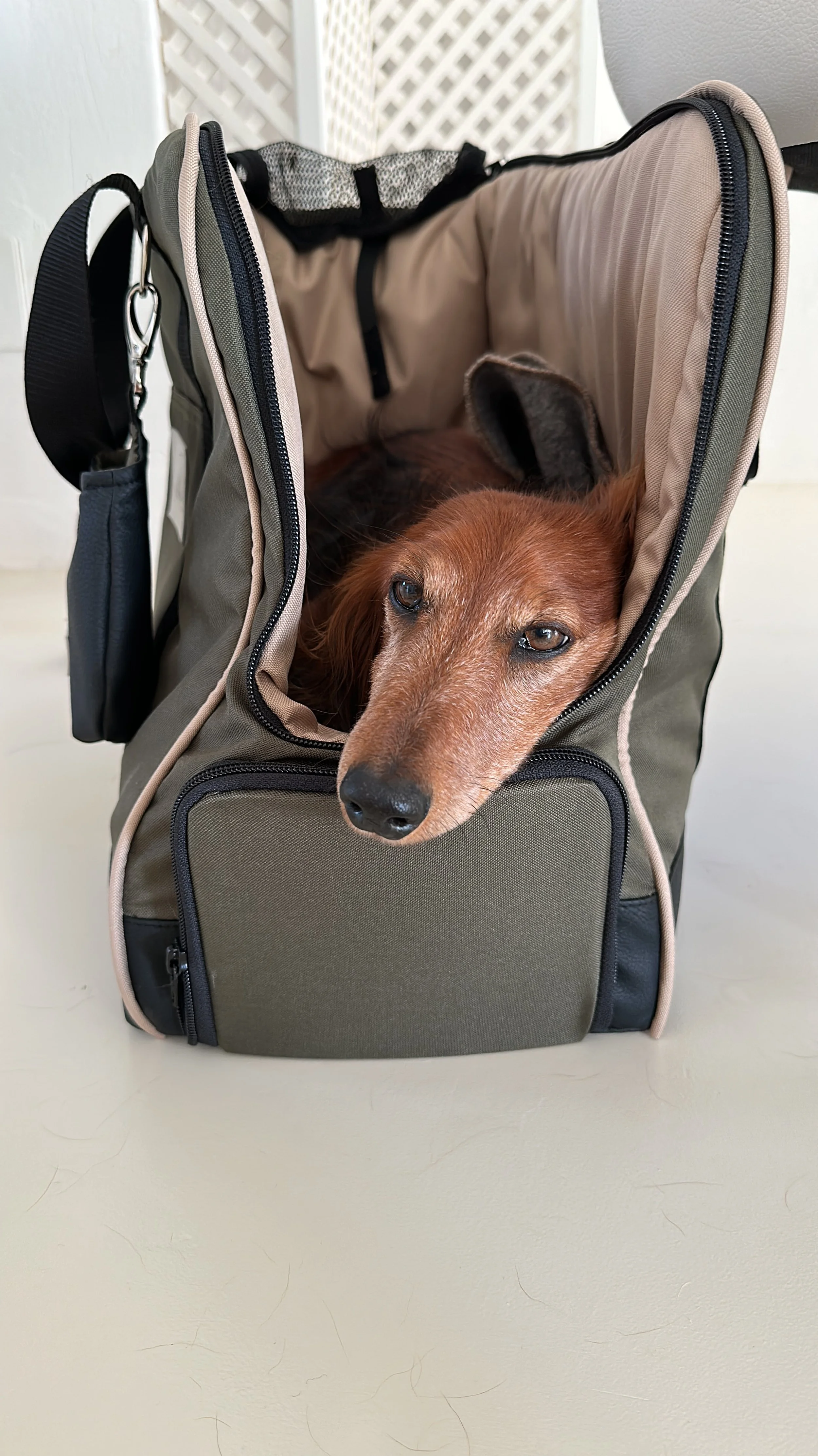 Training: Emma durfte schon Wochen vor Abflug in der Tasche chillen – mit Leckerli, Kuscheldecke und meiner alten Socke (ja, die mit dem vertrauten Geruch, ihr kennt das).